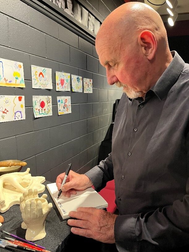 While much of the exhibit focused on his handcrafted ceramic and porcelain sculptures, Ian’s greatest joy was in engaging patrons in participatory art — and particularly, crafting stories from multiple hands! Each evening before the show, Ian would draft the opening line of a new story, and patrons were encouraged to unleash their creativity and add lines to the stories.